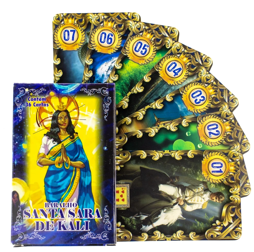 36 Cartas Inspiradoras : Cada carta do Baralho Santa Sara de Kali traz ilustrações e simbólicas que representam a espiritualidade e a energia de Santa Sara, fornecendo insights profundos e mensagens claras. O conjunto é perfeito para leituras intuitivas sobre amor, carreira, saúde e espiritualidade.